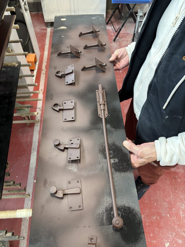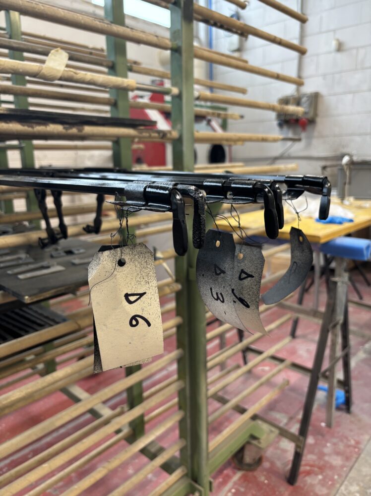 La ferramenta viene interamente smontata e sottoposta a sabbiatura per eliminare ogni traccia di vecchia vernice, prima di essere nuovamente trattata e riverniciata.